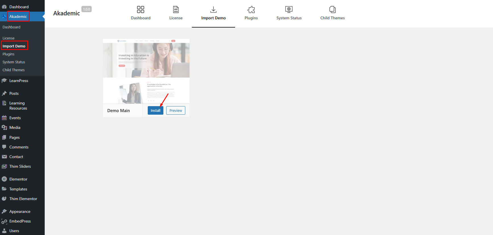 Step 5. Activate ArrowPress Core plugin, enter the license key of Akademic theme. Then you can start the demo data import process.