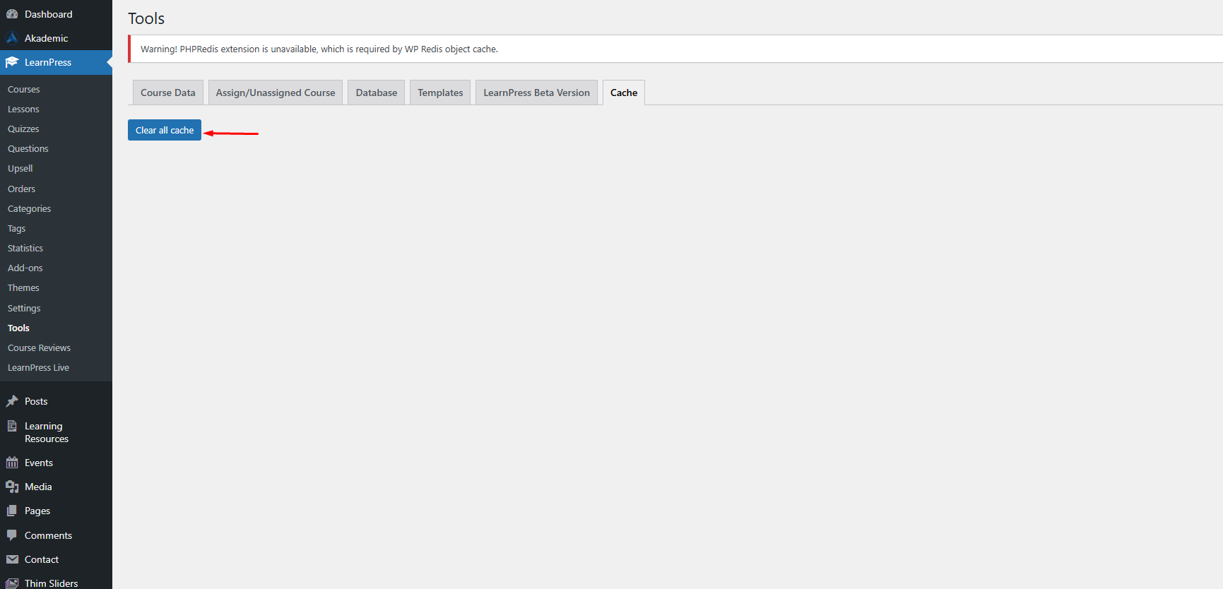 After you successfully imported the demo data, to ensure that LearnPress configurations are the same as our demo, please go to LearnPress => Tools => Cache => Clear all caches to clear the cache.